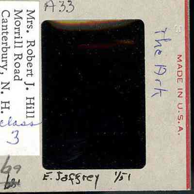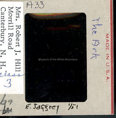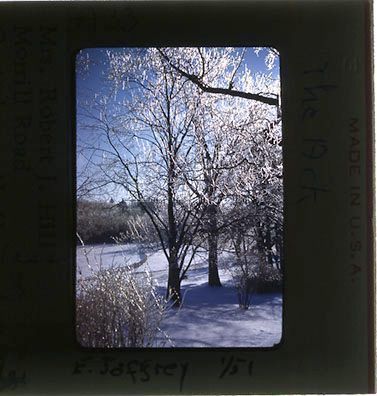 Trees and bushes are covered in ice and dominate the image. Behind the trees is a snow covered field with more trees in the background. Sunlight glints off of the tree branches. On the back, "A33", "The Ark" and "E. Jaffrey, 1/51" is written while a sticker with an address to Mrs. Robert J. Hill at Morrill Road, Canterbury, N.H. has "Class 3" written on it in pen.Collection