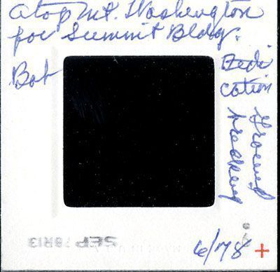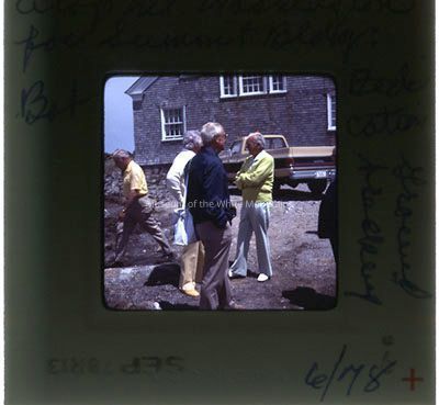 An older man in a blue jacket and trousers is the center of this image. He is looking away to the right and up. Behind him are a couple of men, chatting and another man is walking to the left. A tan truck is parked by a building in the background and the sun is shinging. On the back "Atop Mt. Washington for Summit Bldg, Ground Wrecking", "6/78" and "Bob" are written in pen. It is possible that the man in the photo is Bob.