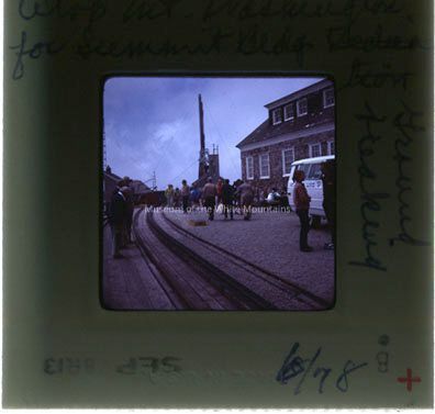 People mill about near train tracks, running along the left side of the image. Most of them are on the right side of the tracks, but several are on the left. It looks like a white van is parked on the right in the foreground next to a tall, brown building. More buildings are situated in the back, one with a tall tower standing tall. Some people appear to be sitting at a table as well. "Atop Mt. Washington for Summit Bldg, Ground Wrecking" and "6/78" are written on the back.Collection