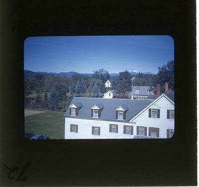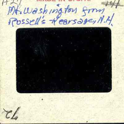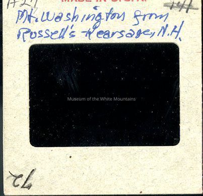 A snow-capped Mt. Washington can be seen in the far distance in this photograph, taken either from a second story window or the roof of a house. Several more white houses stand in the foreground and midground, on the right, surrounded by a green field and a forest of trees. Two automobiles can be seen parked in the left lowerhand corner. On the back, "Mt. Wahsington from Russell's, Kearsarge, N.H.", "A27" and "72" are written in pen.Collection
