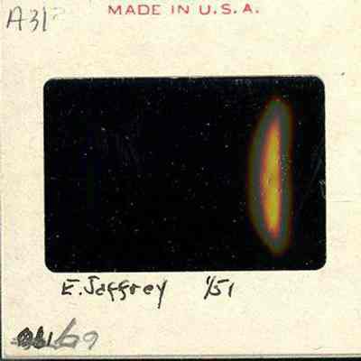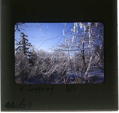 Ice shines off of the tree branches hanging across the right side of the image, in the forefront. Farther back, more ice covered trees can be seen as well as a snow-covered field. On the back is written "E. Jaffrey 1/51" and "A31"