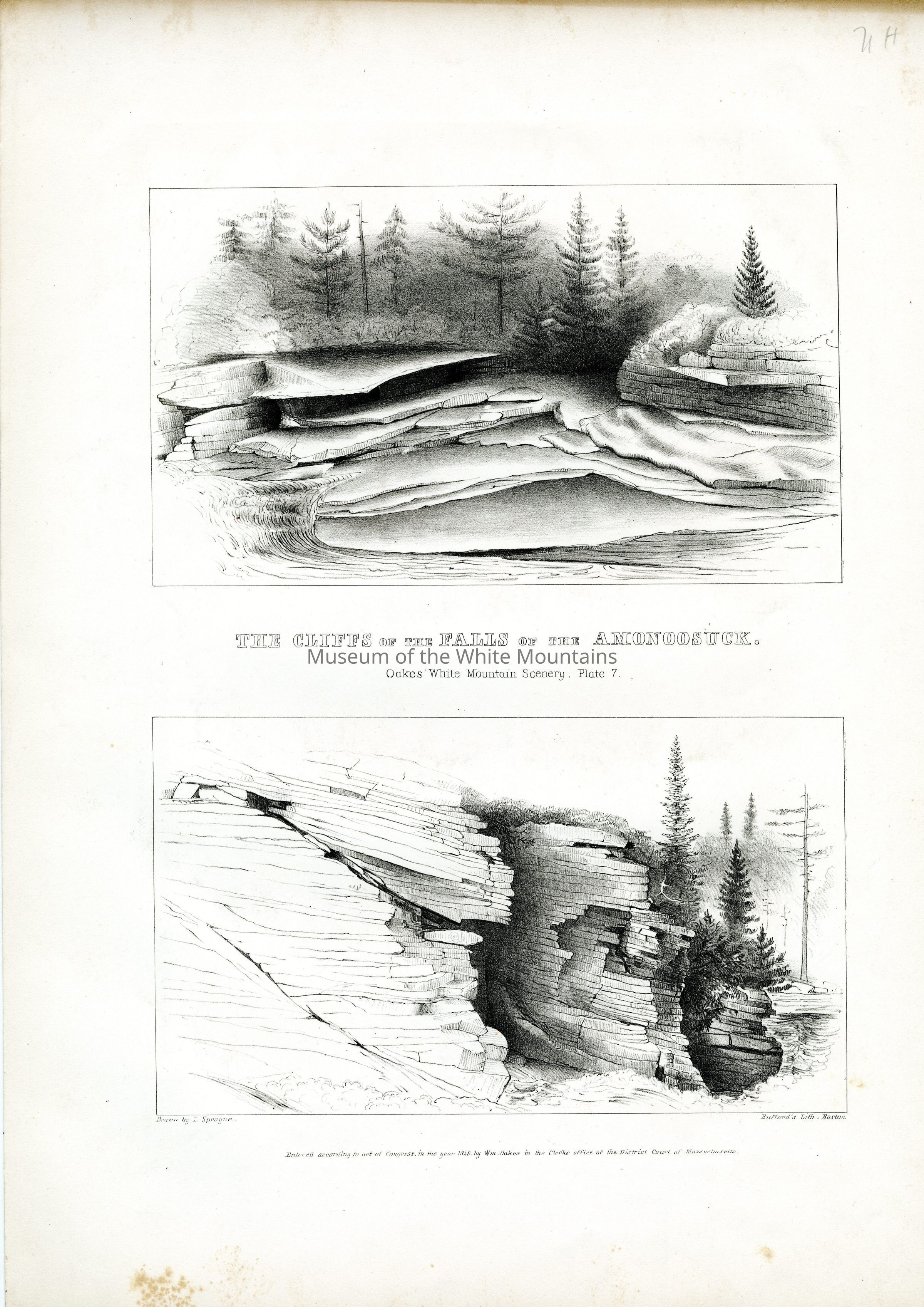 THE CLIFFS OF THE FALLS OF THE AMONOOSUCK. / Oakes' White Mountains Scenery, Plate 7.Language