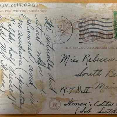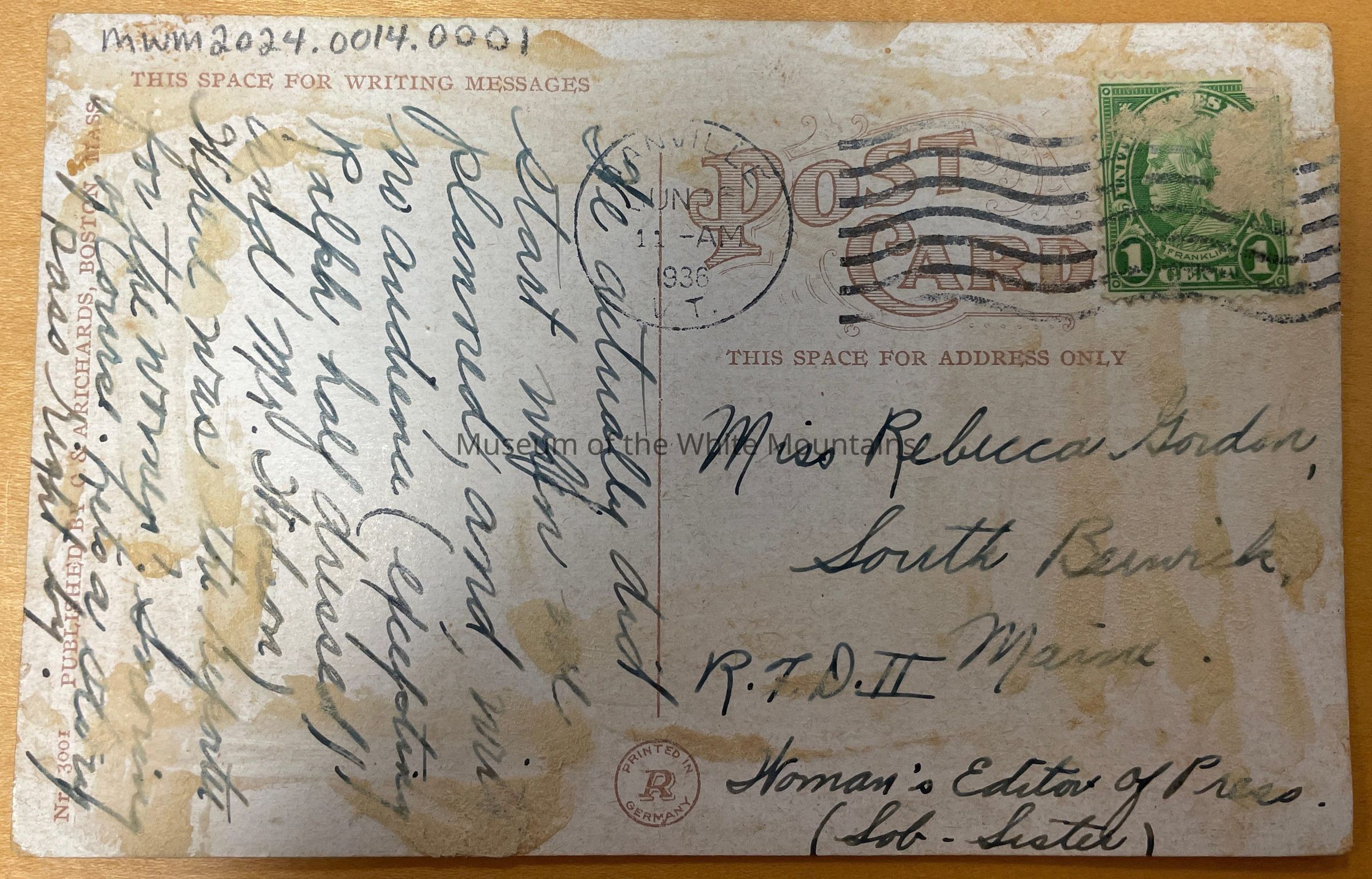 Back Description: Typical postcard back. Postmarked June 11, 1936 to Miss Rebecca Gordon, South Berwick, Maine, R. F. D. II, Women's Editor of Press [illegible-Sister]