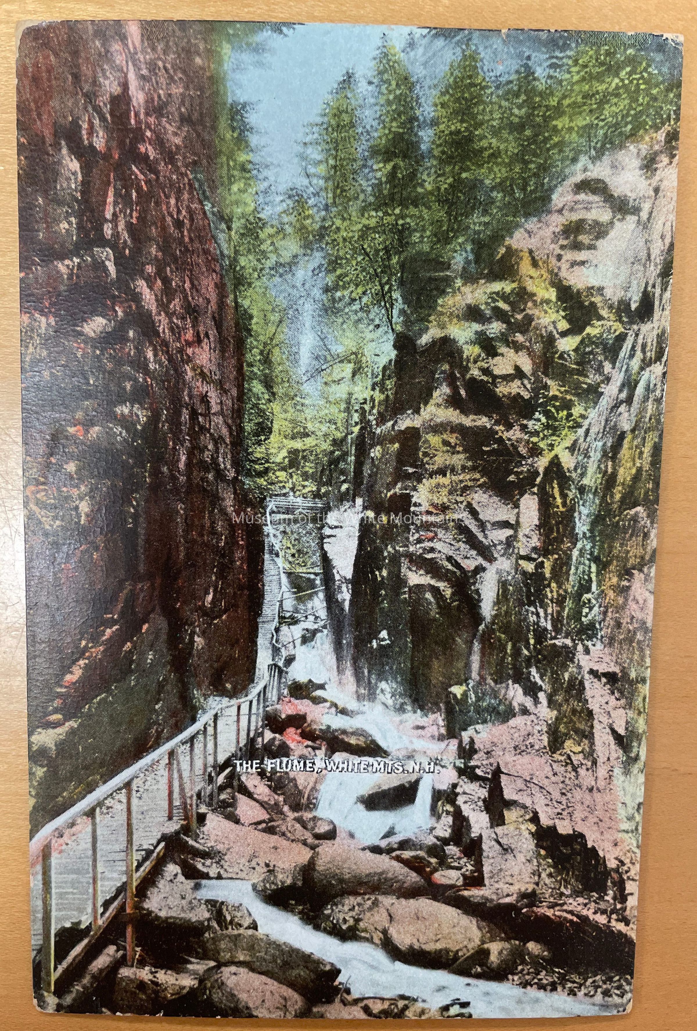 Colorized image featuring the Flume Gorge in the White Mountains of New Hampshire. The image depicts a sunny day during summer with foliage in full bloom while the water flows quickly down the waterfall and over the rocks near the wooden pathway.