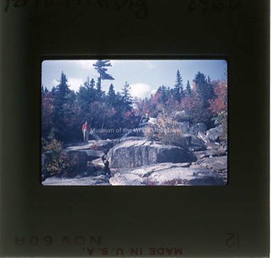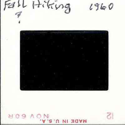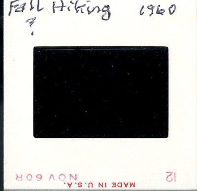 A person stands on a rock on the left side of the image. Rocks cover the foreground of the image, with a small amount a water trickling through. In the background, autumn leaves are on the trees. On the back "Fall Hiking 1960" and a "?" are written in pen.