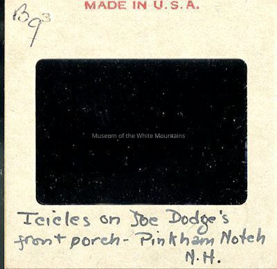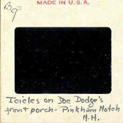 Icicles hang off of a man's porch and become the center piece of the image. Behind them, is a heap of snow that then leads into a snow-covered forest. On the back, "Icicles on Joe Dodge's porch--Pinkham Notch, N.H." and "B9" are written in pen.