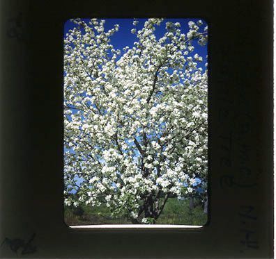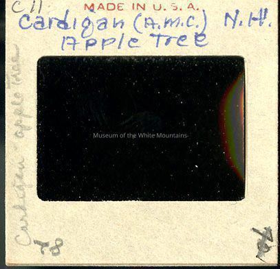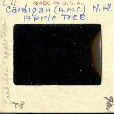 An apple tree is in full blossom and stands in the center of the image. Behind the tree is a green field and blue sky. On the back, "Cardigan (A.M.C.) N.H. Apple Tree", "Cardigan Apple Tree" and "C11" are written.