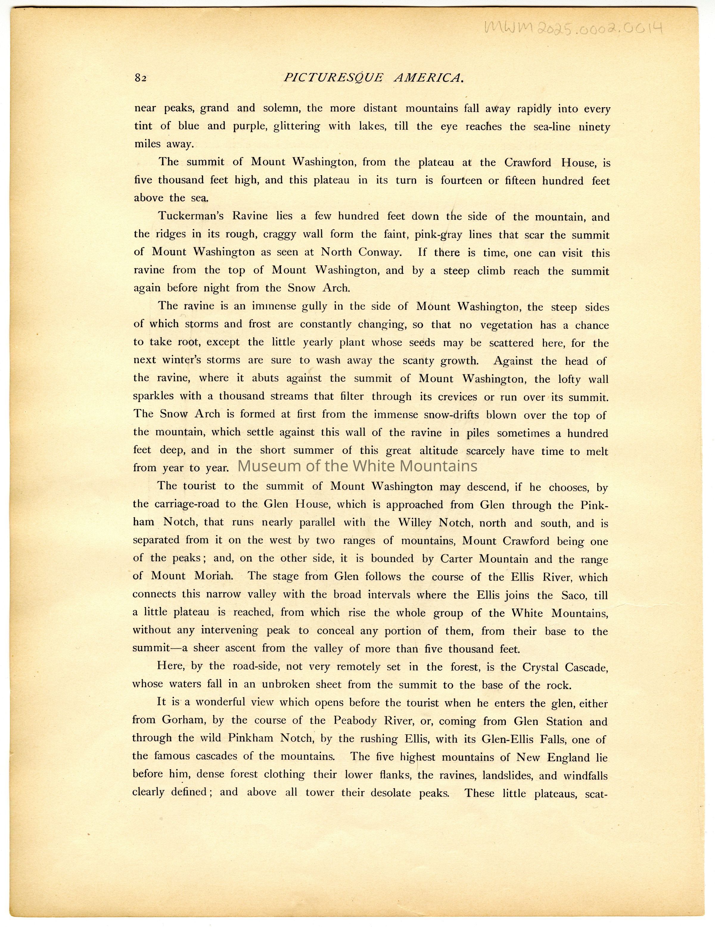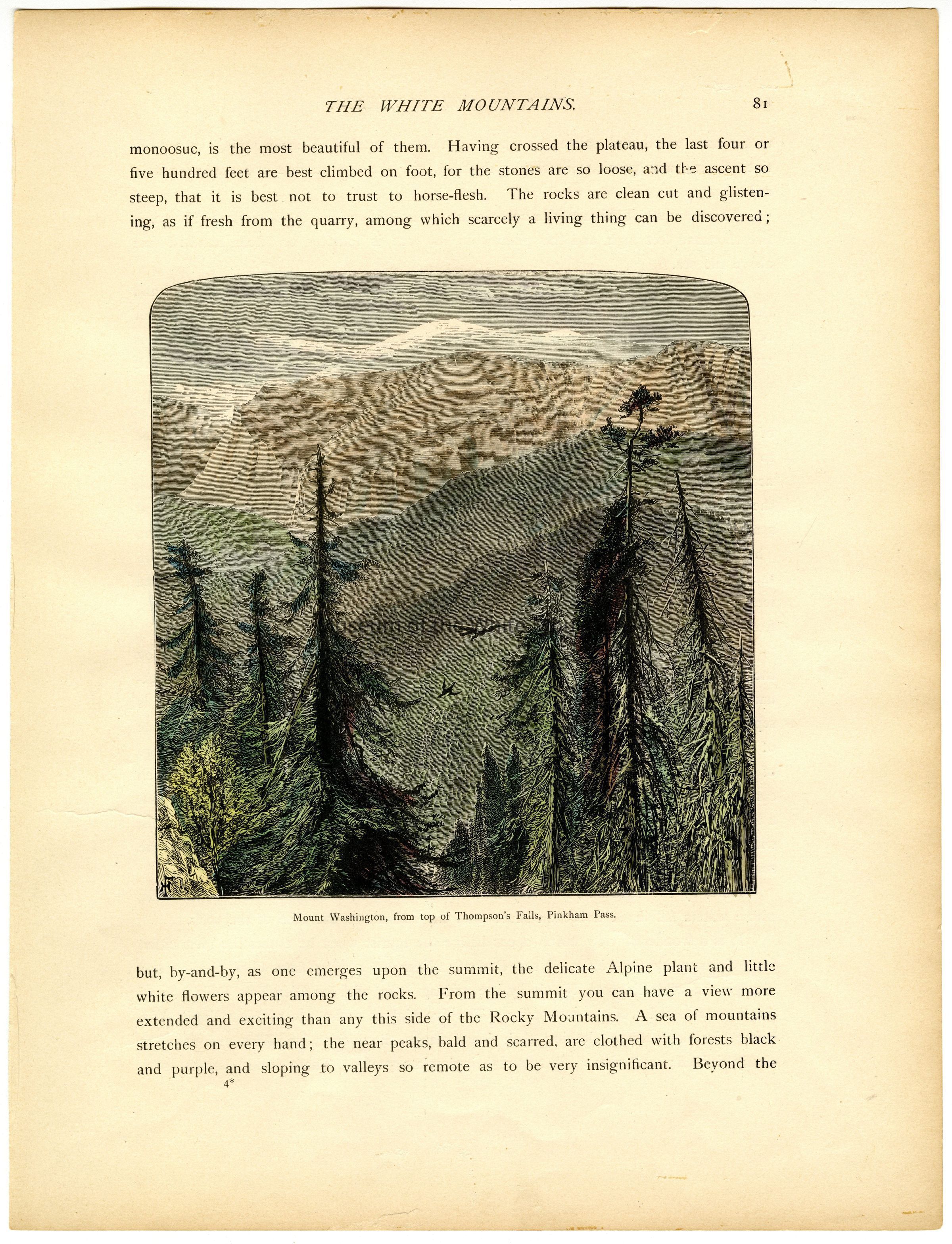 A page (81-82) from a publication entitled 'Picturesque America,' with an engraving on the 'front' of Mount Washington from the top of Thompson's Falls in Pinkham Pass.Type of Print