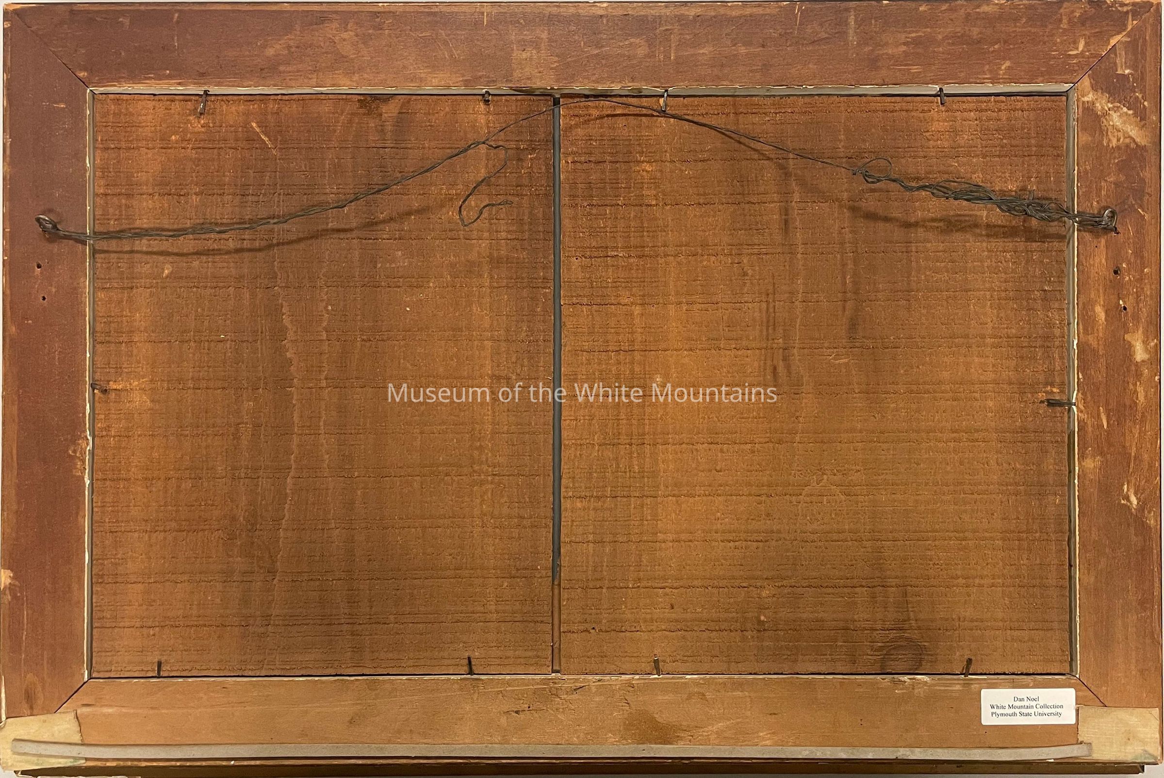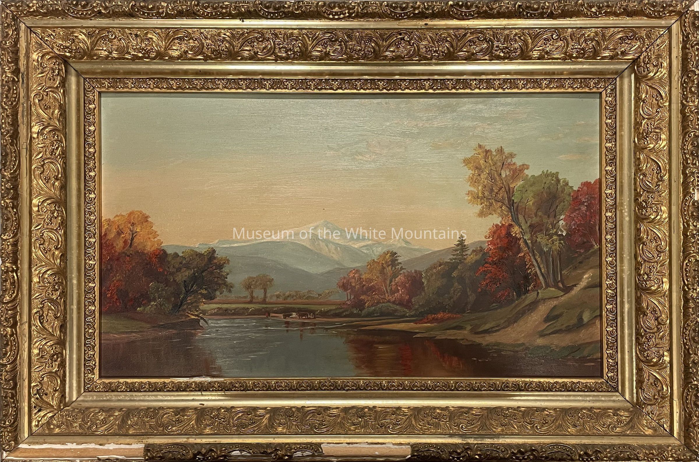 Landscape view of the White Mountains in the center background and a wide river in the foreground. Tree near and along the river's edge sport some leaves of red and yellow. Cattle, dwarfed by the landscape stand on the sandy bank.Collection