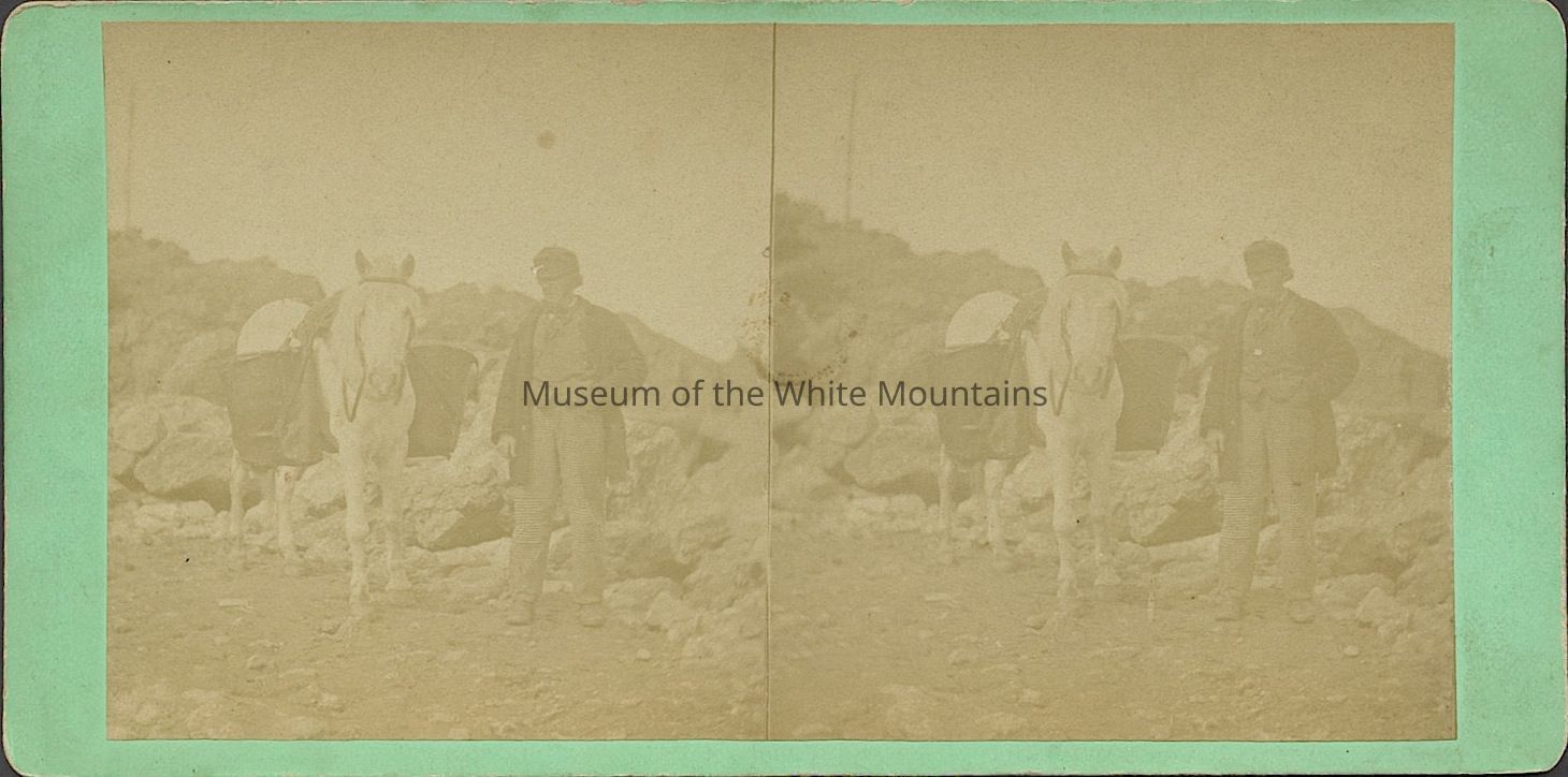 Black and white image of a man and small horse standing on a rocky path. Image features a donkey named "Snowball". Back Description: Plain with writing