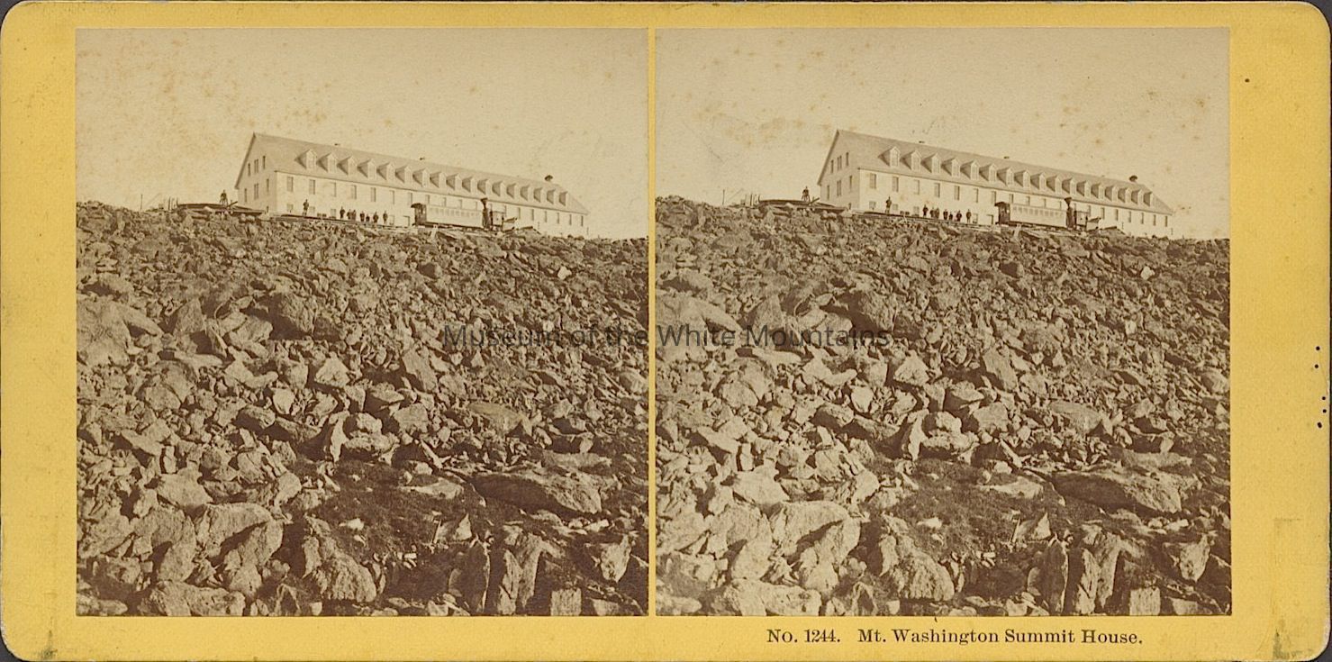 Black and white image of a boarding house at the top of a mountain with a railroad car in front of it. Caption reads, "Mt Washington Summit House." Back Description: Plain