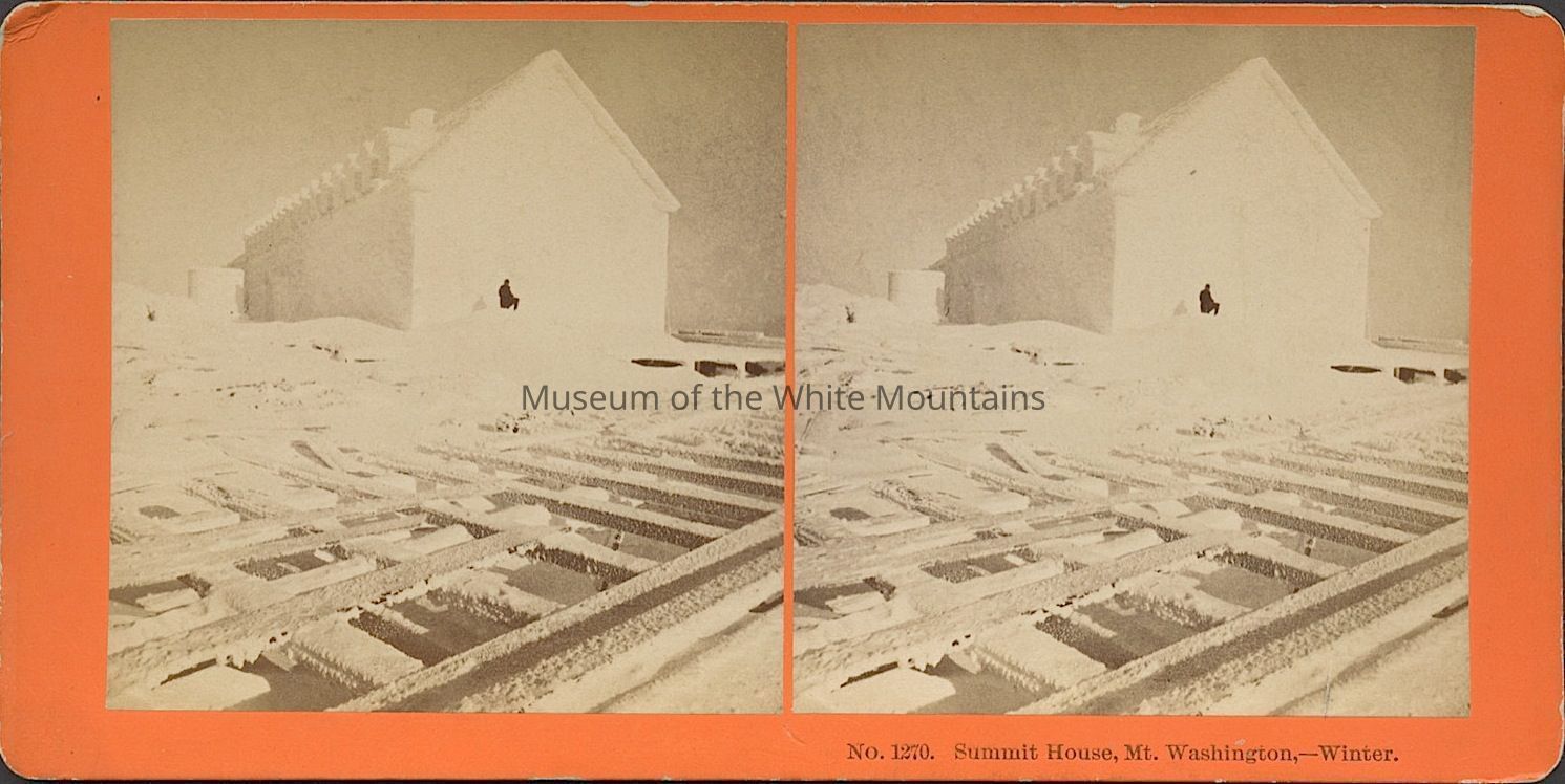 Black and white image of a snow-covered boarding house with railroad tracks running by it. A person is outside. Caption reads, "Summit House Mount Washington, Winter of 1870-71." Back Description: Plain