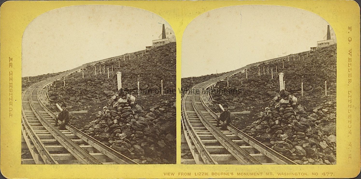 Washington, Mount (Coos county, New Hampshire : mountain), Summit House (Coos county, New Hampshire : inhabited place), Lizzie Bourne Monument (Coos county, New Hampshire : monument), Mount Washington Cog Railway, people, monuments, railroad tracks, Buildings, Boardinghouses