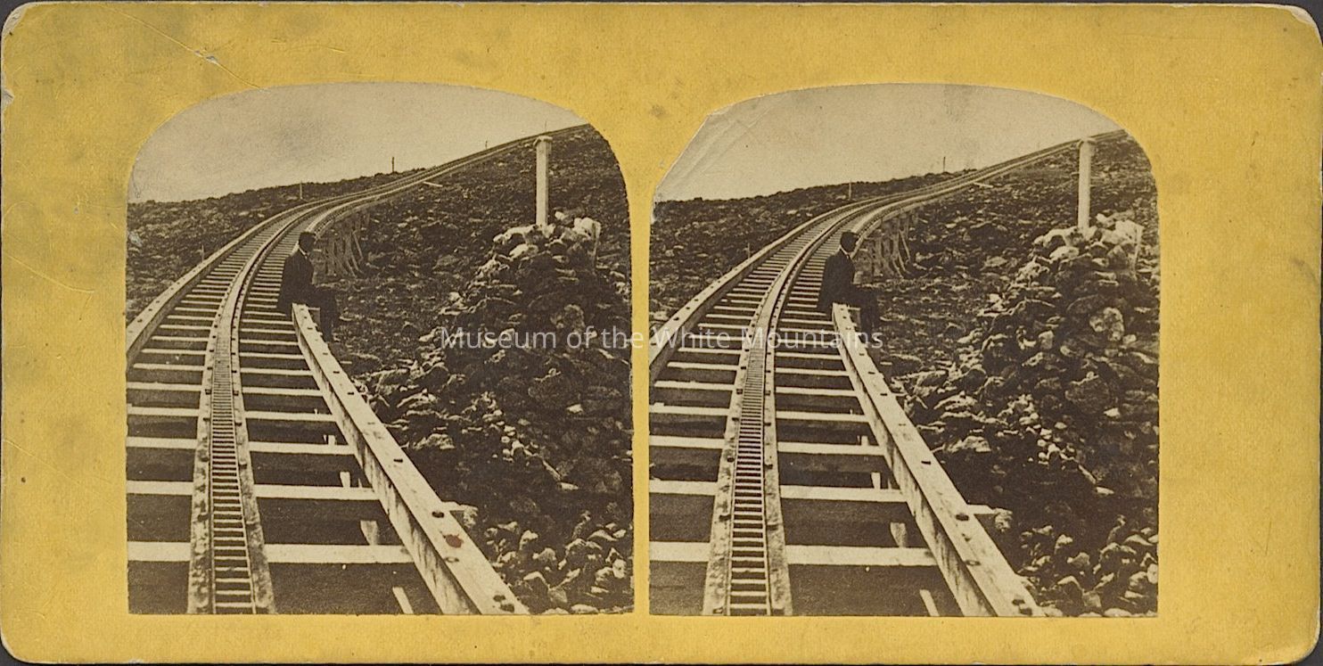 Black and white image of a person sitting on railroad tracks by a monument made of stones. The tracks travel up a mountain. Back Description: list of items with writing