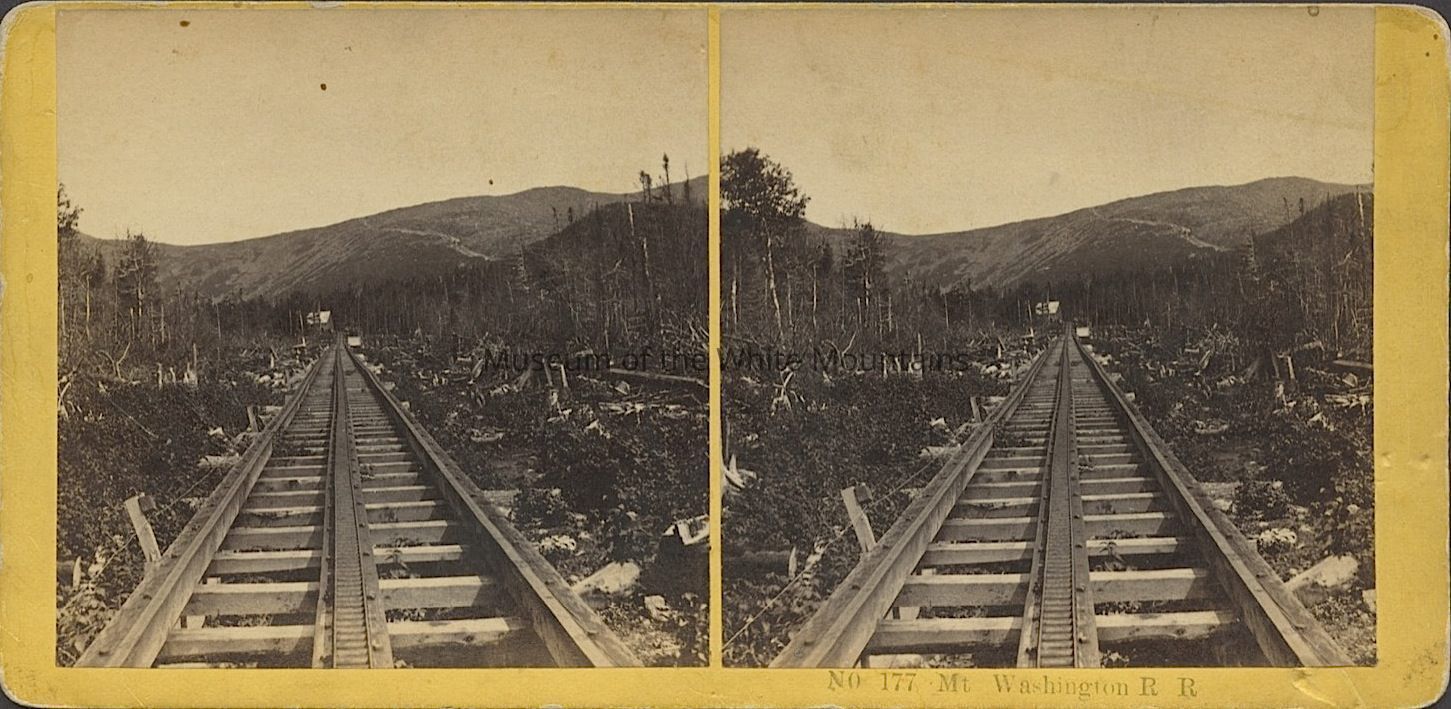 Washington, Mount (Coos county, New Hampshire : mountain), Mount Washington Cog Railway, railroad tracks, mountains, tree stumps