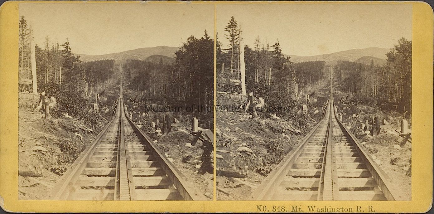 Washington, Mount (Coos county, New Hampshire : mountain), Mount Washington Cog Railway, railroad tracks, mountains, tree stumps