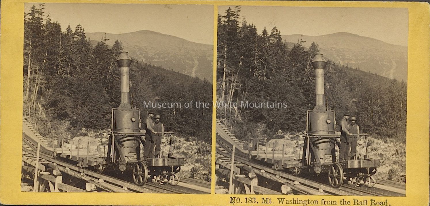 Washington, Mount (Coos county, New Hampshire : mountain), Mount Washington Cog Railway, railroad tracks, railroad engines, people, mountains