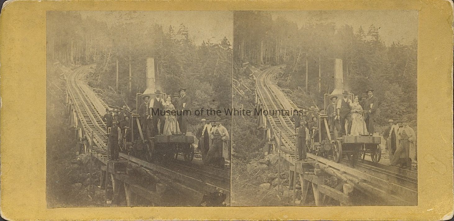 Black and white image of a railroad engine on tracks with people on it and on the tracks. It is in a rocky, wooded setting. Back Description: Plain