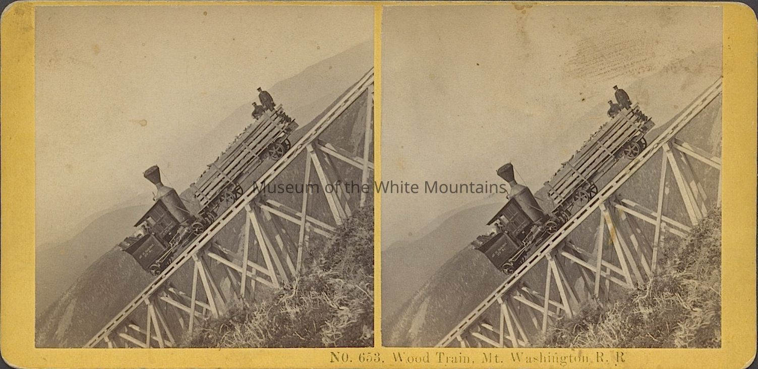 Washington, Mount (Coos county, New Hampshire : mountain), Mount Washington Cog Railway, railroad tracks, trestles, people, trains, cargo