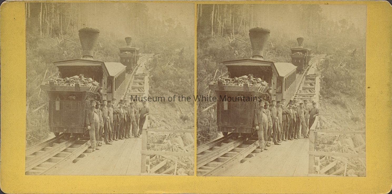 Black and white image of a two trains on tracks in a wooded area carrying rocks or wood. Several men stand by the trains. Back Description: Patterned.