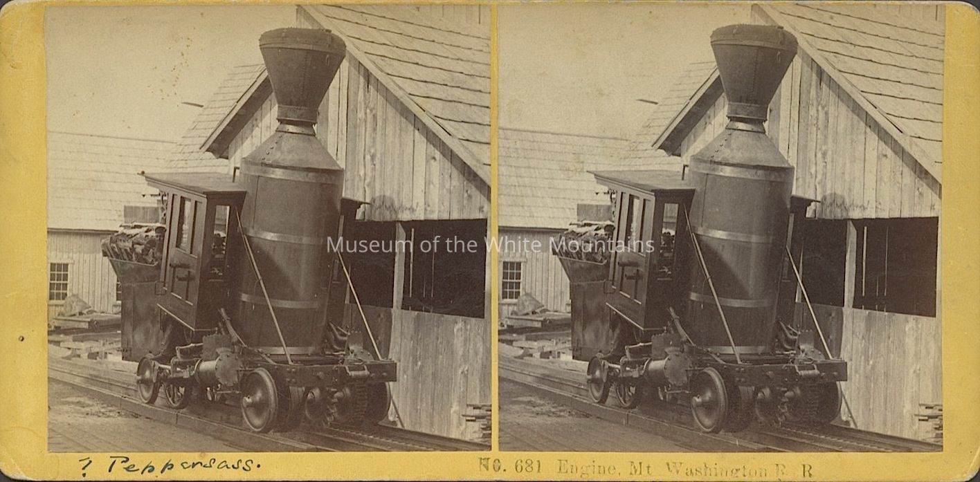 Black and white image of a railroad engine on tracks outside buildings. It has a cargo of wood. Caption reads, "engine Mt Washington RR." Written, "Peppersass?" Back Description: Plain with writing