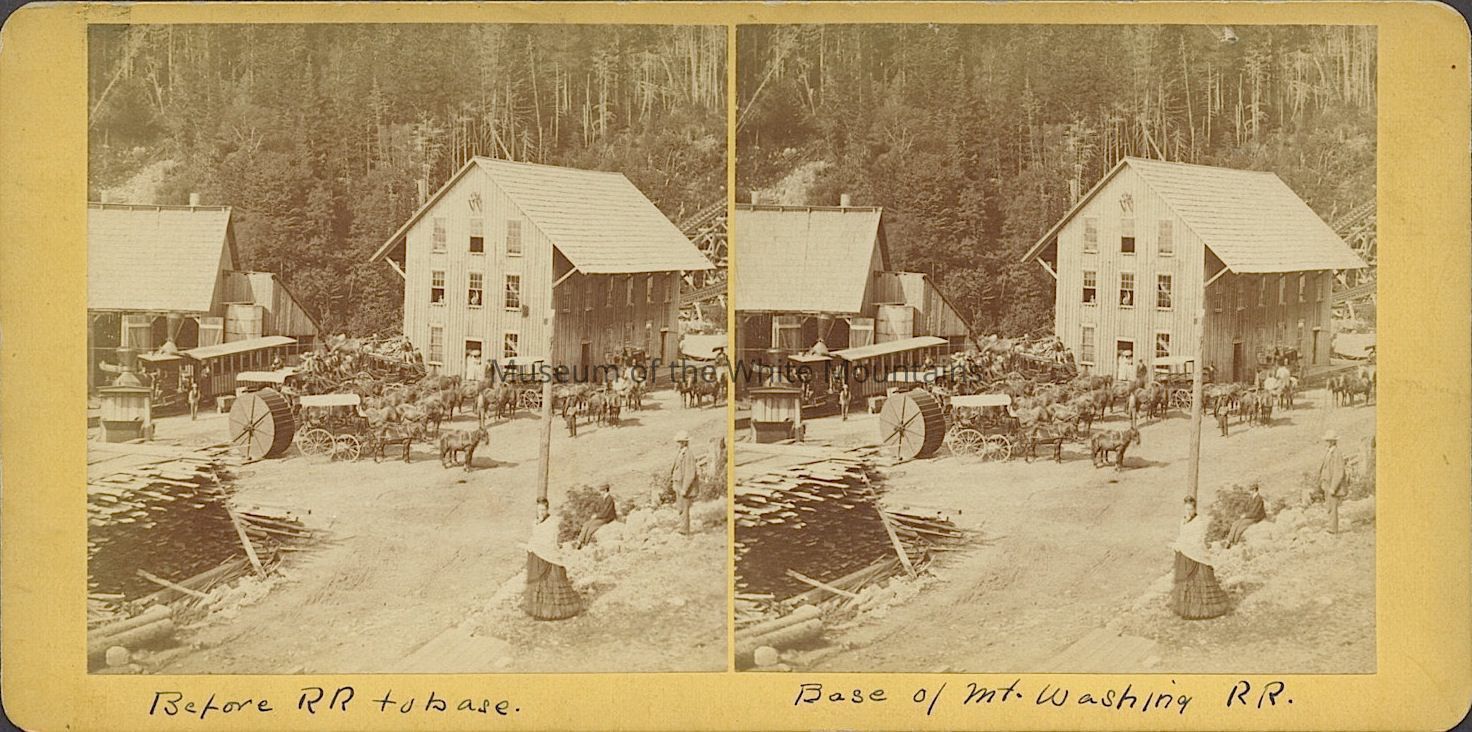Black and white image of buildings including a boarding house and a railroad depot. Many people are in view. Also in view is lumber, coaches, carriages, horses, a train, a railroad engine, and a water wheel. Caption reads, "Before Railroad to Base" "Base of Mt. Washington Railroad"