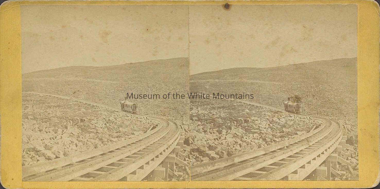 Black and white image of a train traveling down a set of tracks in a rocky mountain setting. Back Description: Plain