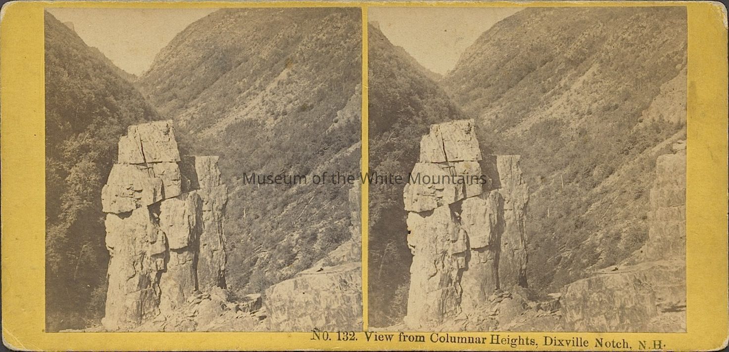 Black and white image of a rock formation among mountains. Caption reads, "View from Columnar Heights, Dixville Notch NH." Back Description: Plain