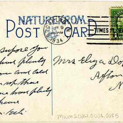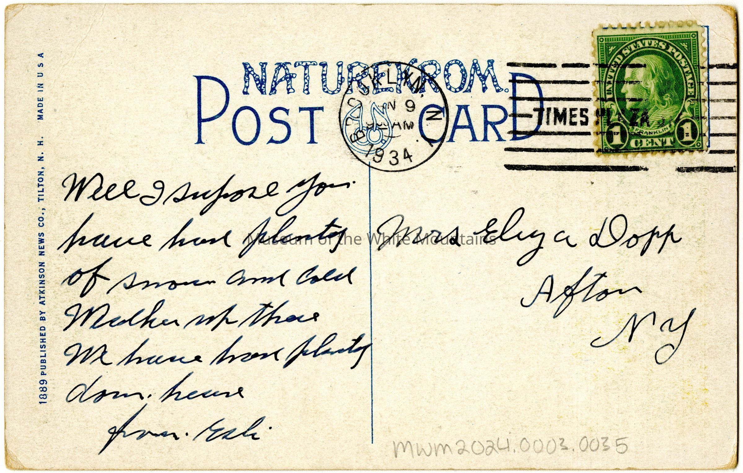 Divided postcard back. Postmarked from Brooklyn, NY on [January] 9, 1934 at 9am.