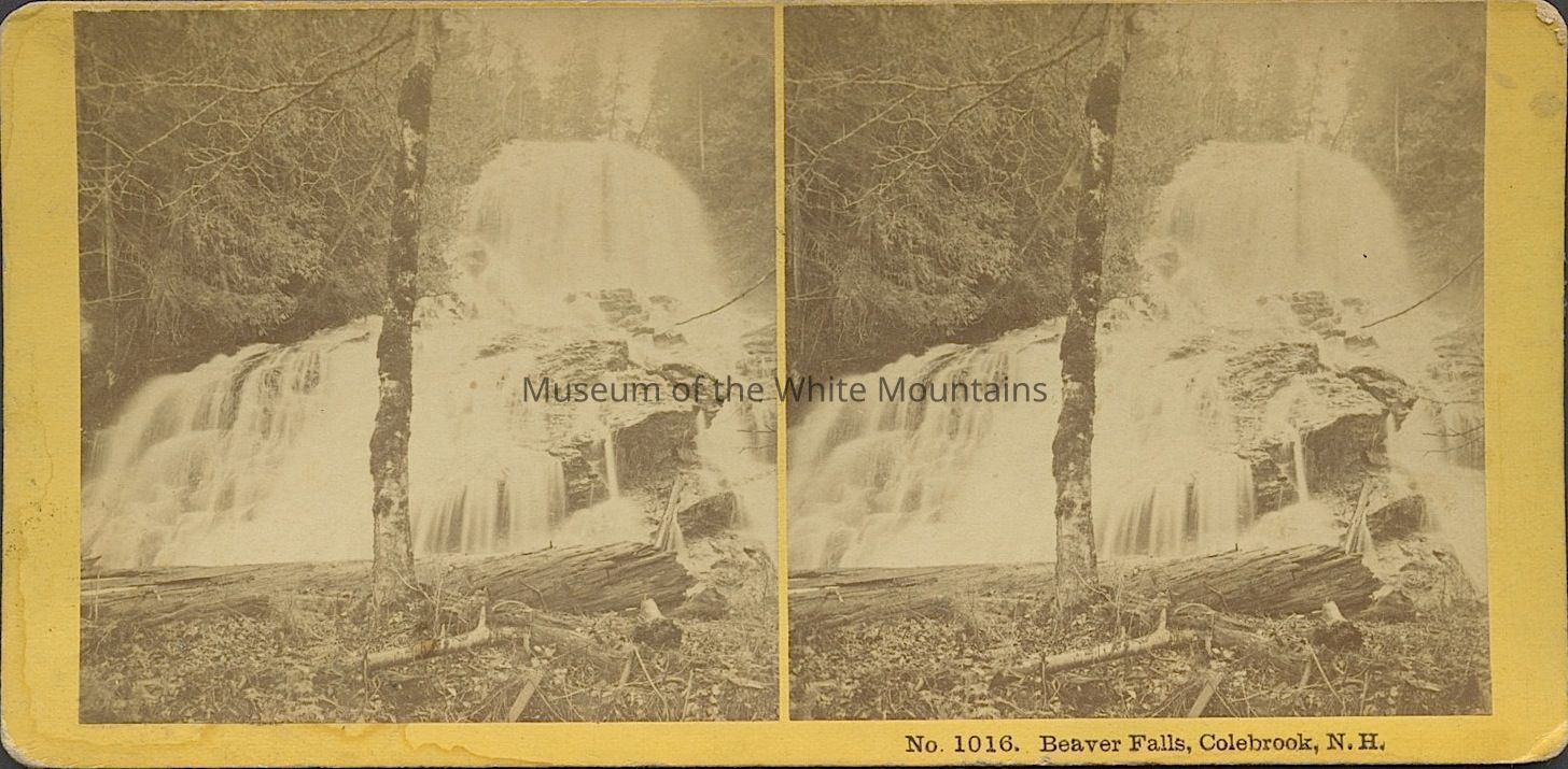 Black and white image of a waterfall among rocks and trees. Caption reads, "Beaver Falls, Colebrook NH." Back Description: Plain with writing