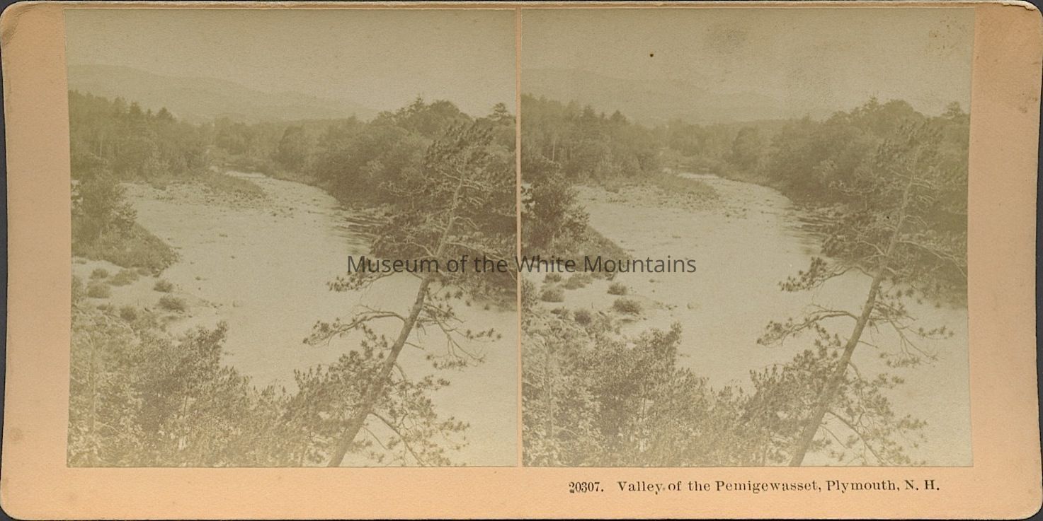 Black and white image of a river lined with trees and mountains in the background. Caption reads, "Valley of the Pemigewasset, Plymouth NH." Back Description: Plain