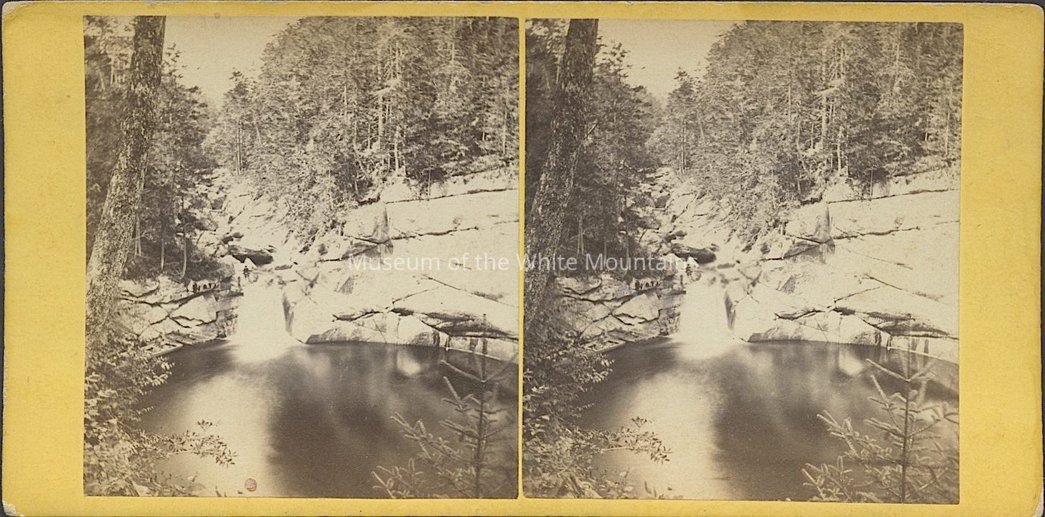 Black and white image of a waterfall into a pool below. Pool is surrounded by rocky ledges and trees. A person stands by the waterfall. Back Description: Plain