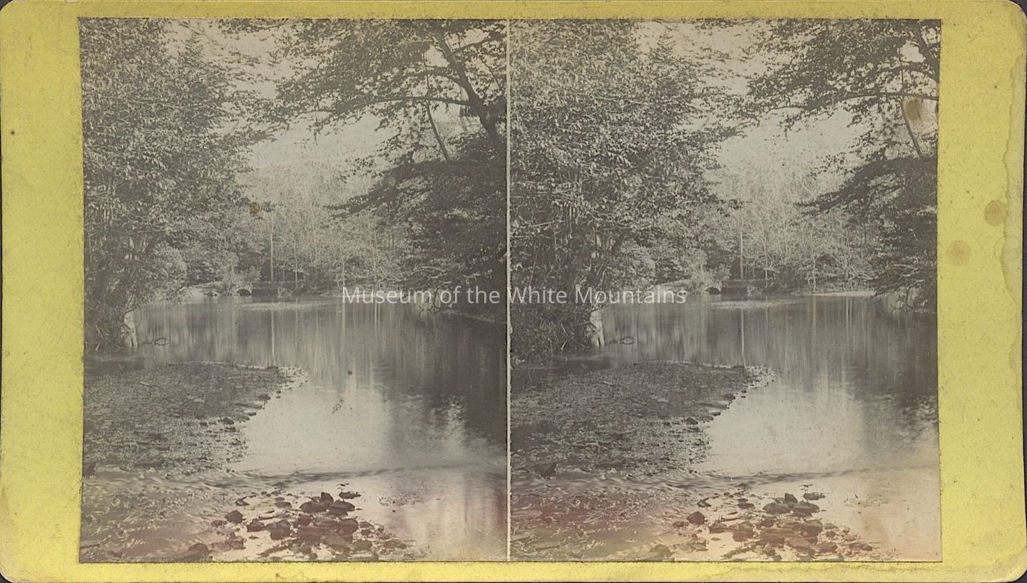 Black and white image of a lake surrounded by trees. Back Description: Plain