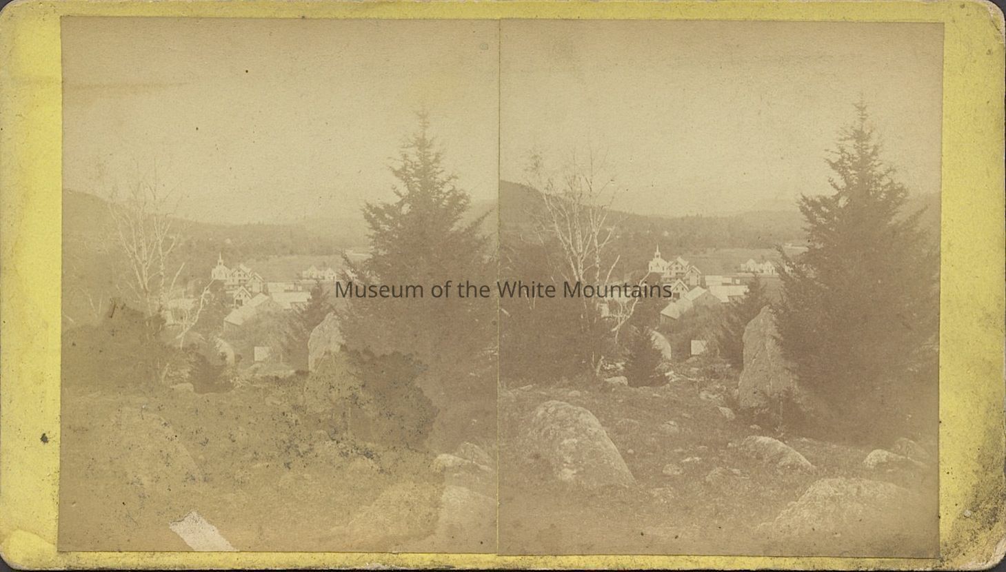 Black and white image of a town with mountains in the background. In the foreground are rocks and trees. In view are homes, barns, a church. Back Description: Plain
