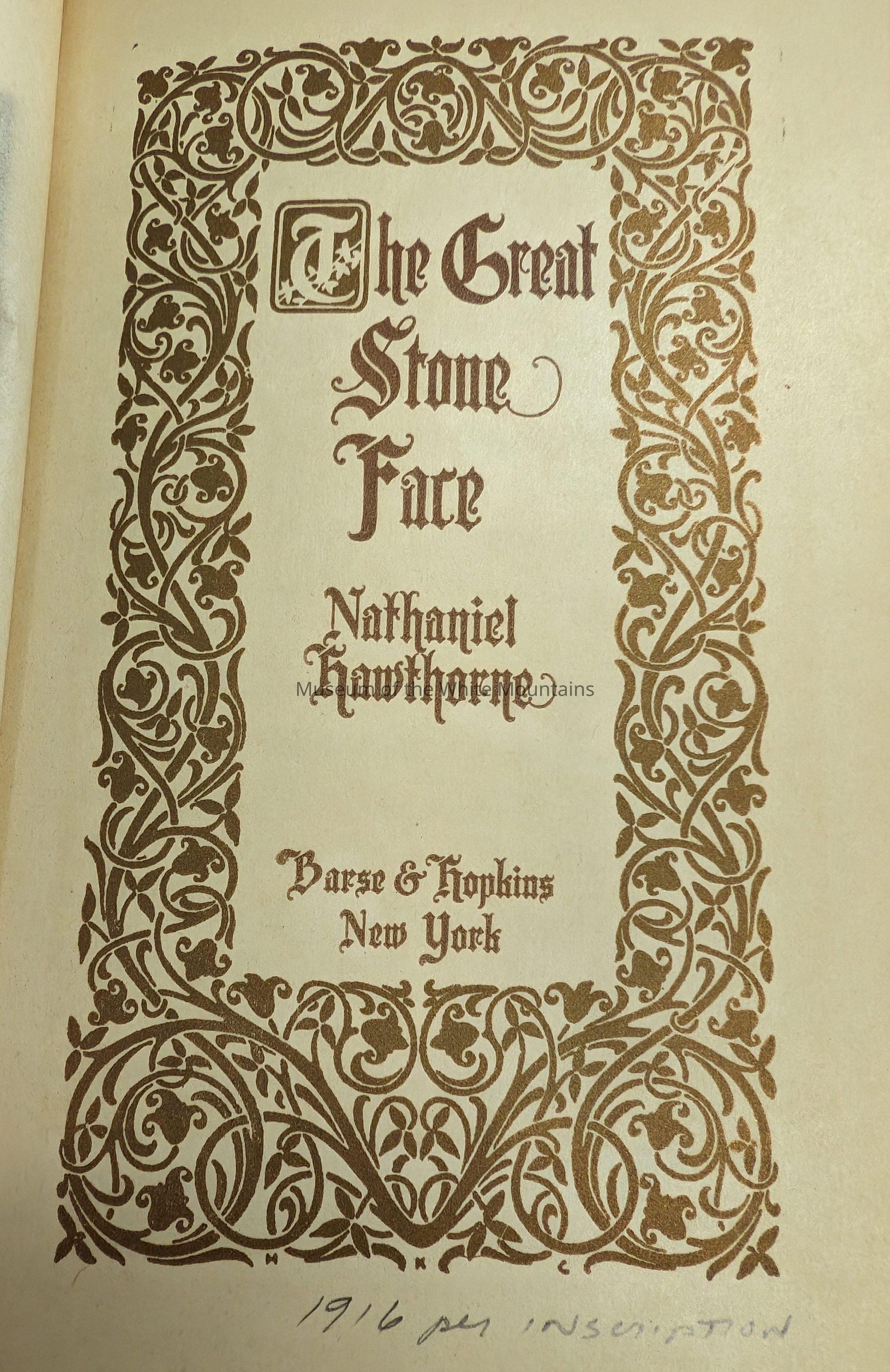 This is a story written by Nathaniel Hawthorne about the legend and prophecy of the Old Man of the Mountain. There is a signature on the front free end paper dated to March 1916 and that is believed to be the dating of this book.