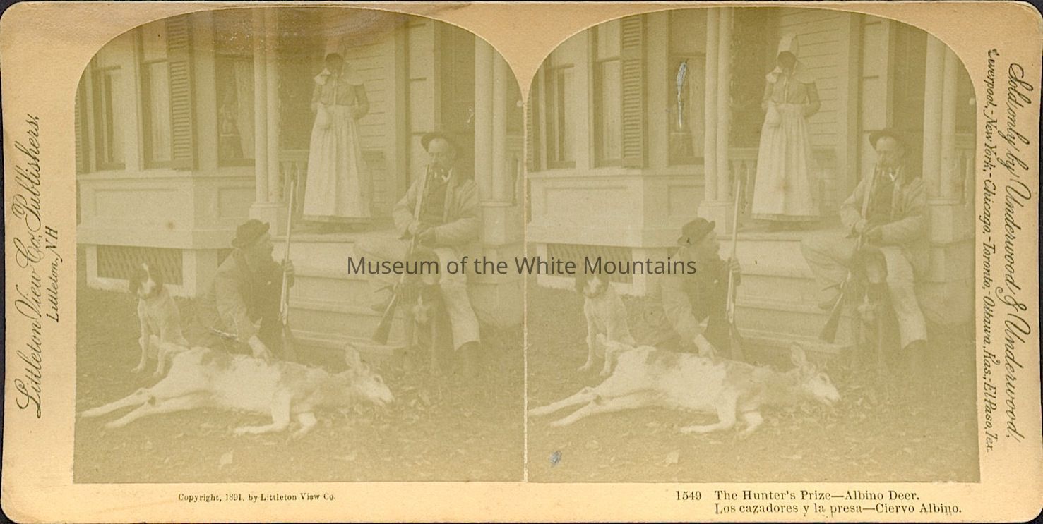Black and white image of people by a porch. One man has a gun and is touching a dead deer. Another man has a gun. Both men have dogs. There is also a woman looking on. Caption reads, "The Hunter's Prize- Albino deer." Back Description: Plain
