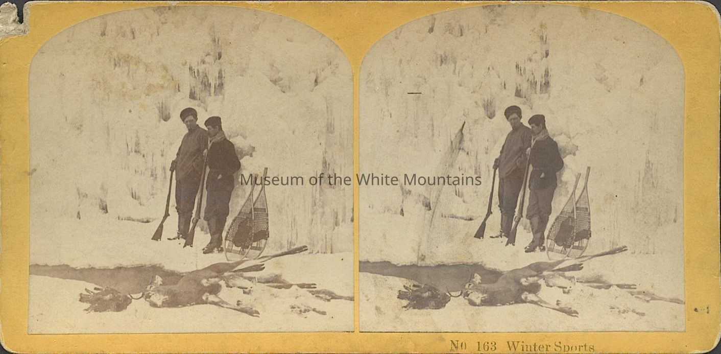 Black and white image of men standing in a winter scene holding guns with snow shoes by them. On the ground is a dead deer. Caption reads, "Winter Sports." Back Description: Plain