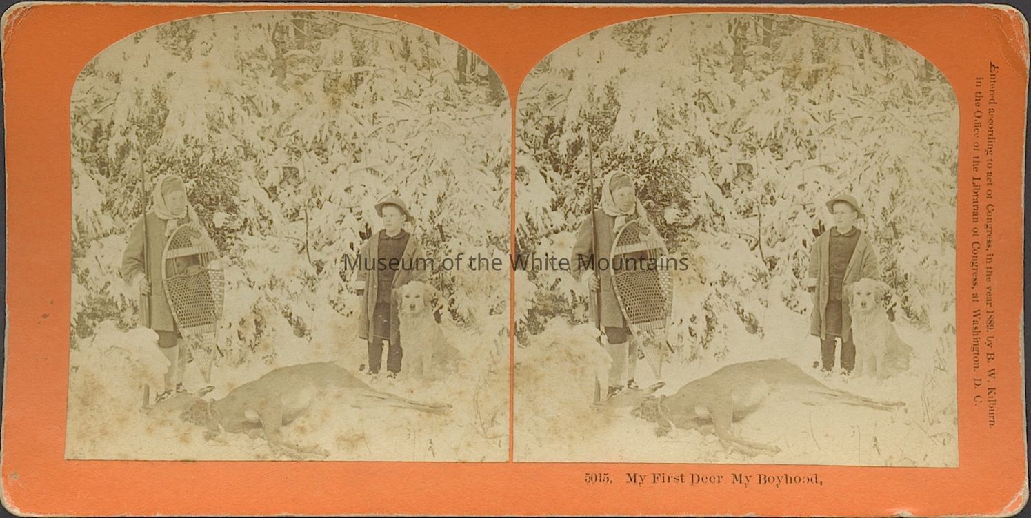 Black and white image of two children. One holds a gun and snow shoe. The other has a dog. On the ground is a dead deer. They stand in a snowy scene. Caption reads, "My First Deer, My Boyhood." Back Description: Plain