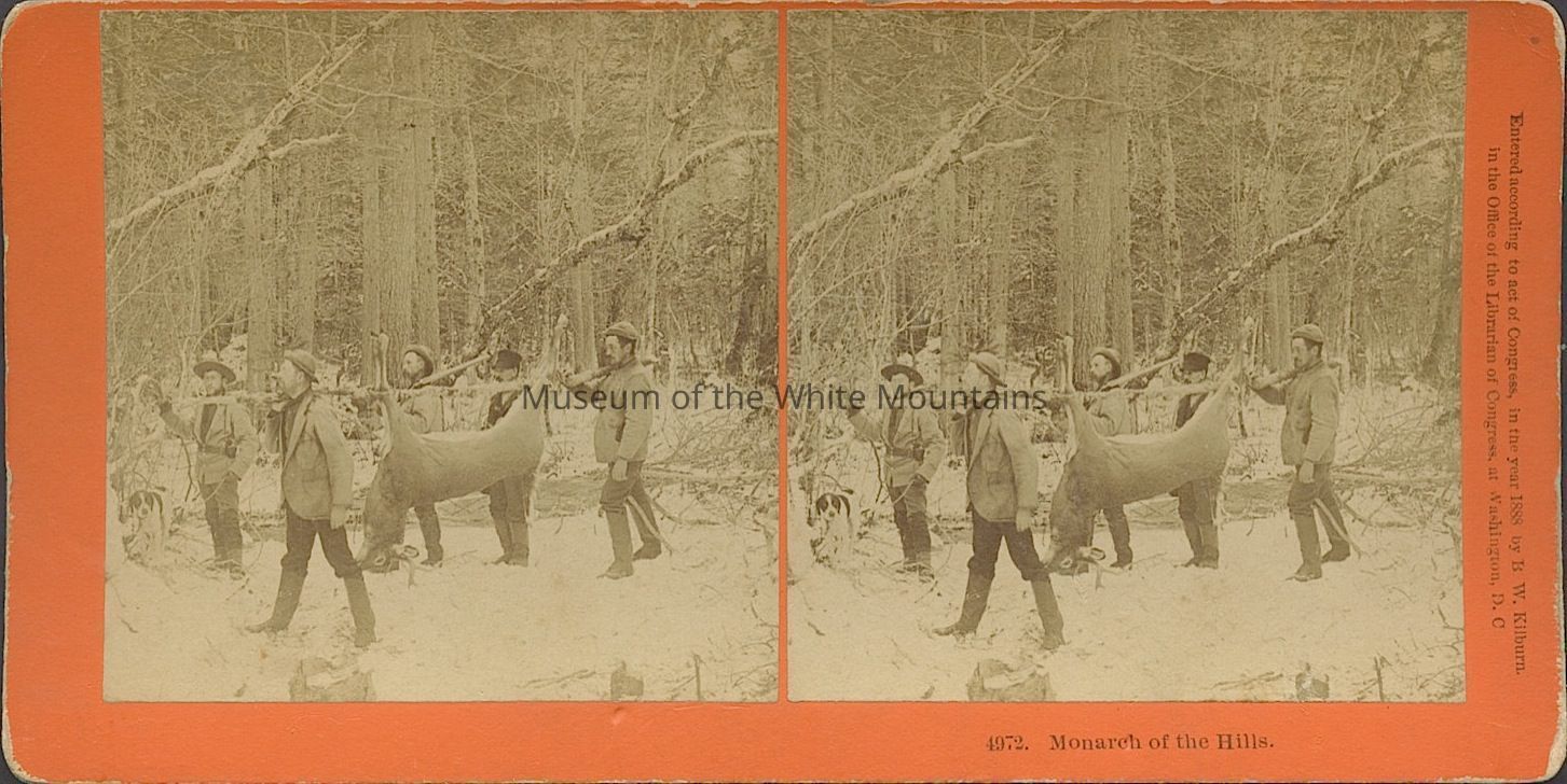 Black and white image of several men carrying a dead deer attached to a pole out of a snowy wooded area. Caption reads, "Monarch of the Hills." Back Description: Plain