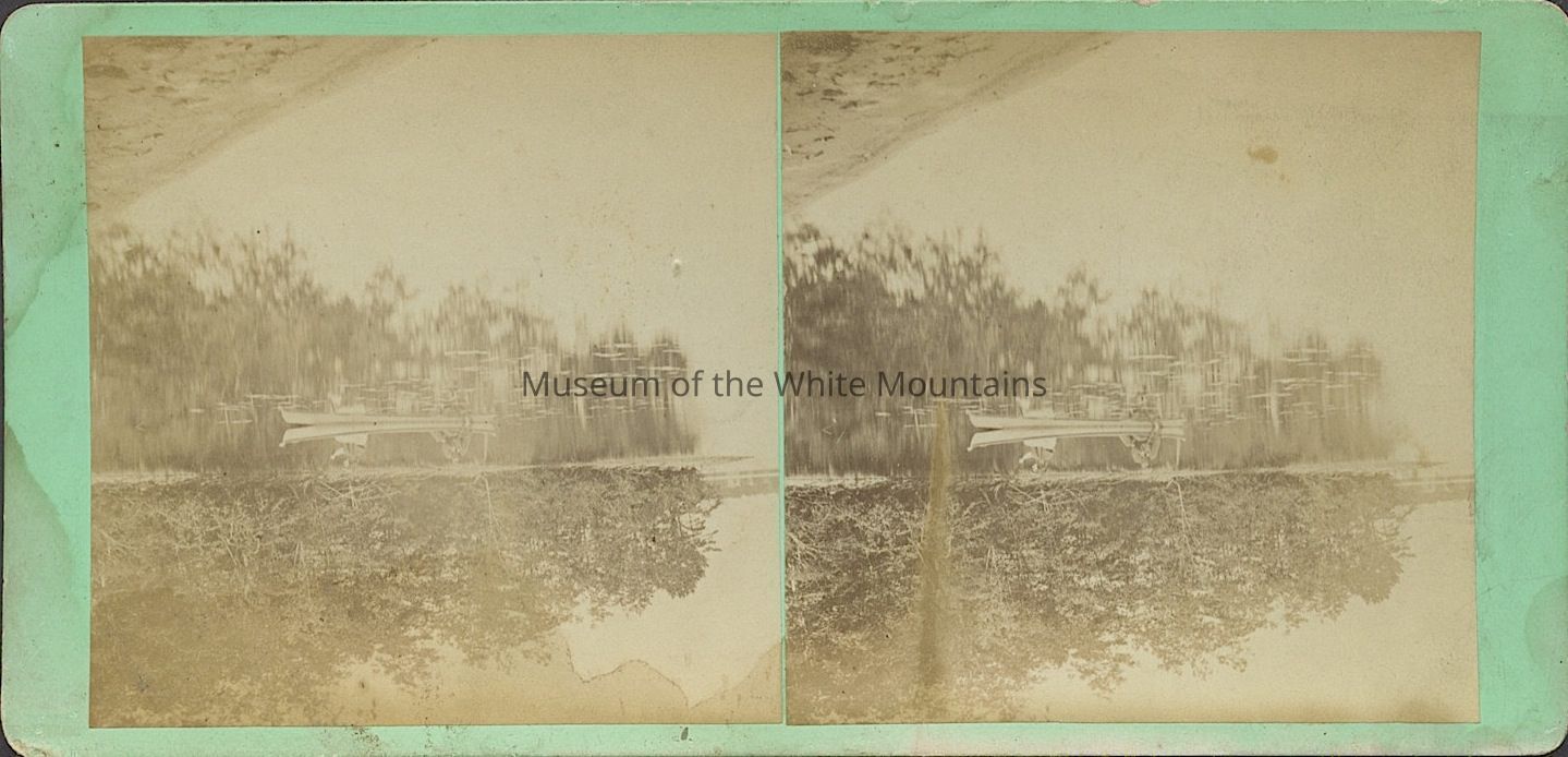 Black and white image of a lake with people rowing a canoe on it. A sandy shore is in view. Back Description: Plain with writing