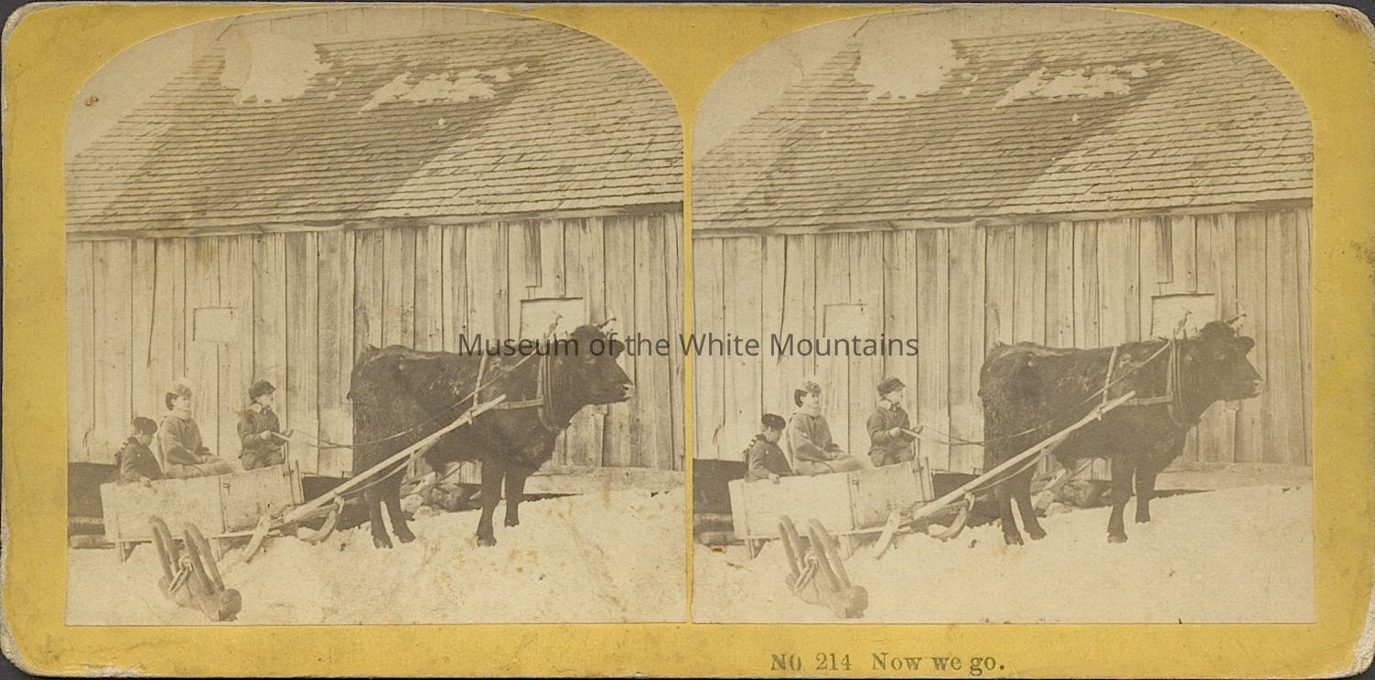 Black and white image of a bull pulling a sleigh with people in it. A barn and yoke is in view. Caption reads, "Now we go." Back Description: Plain