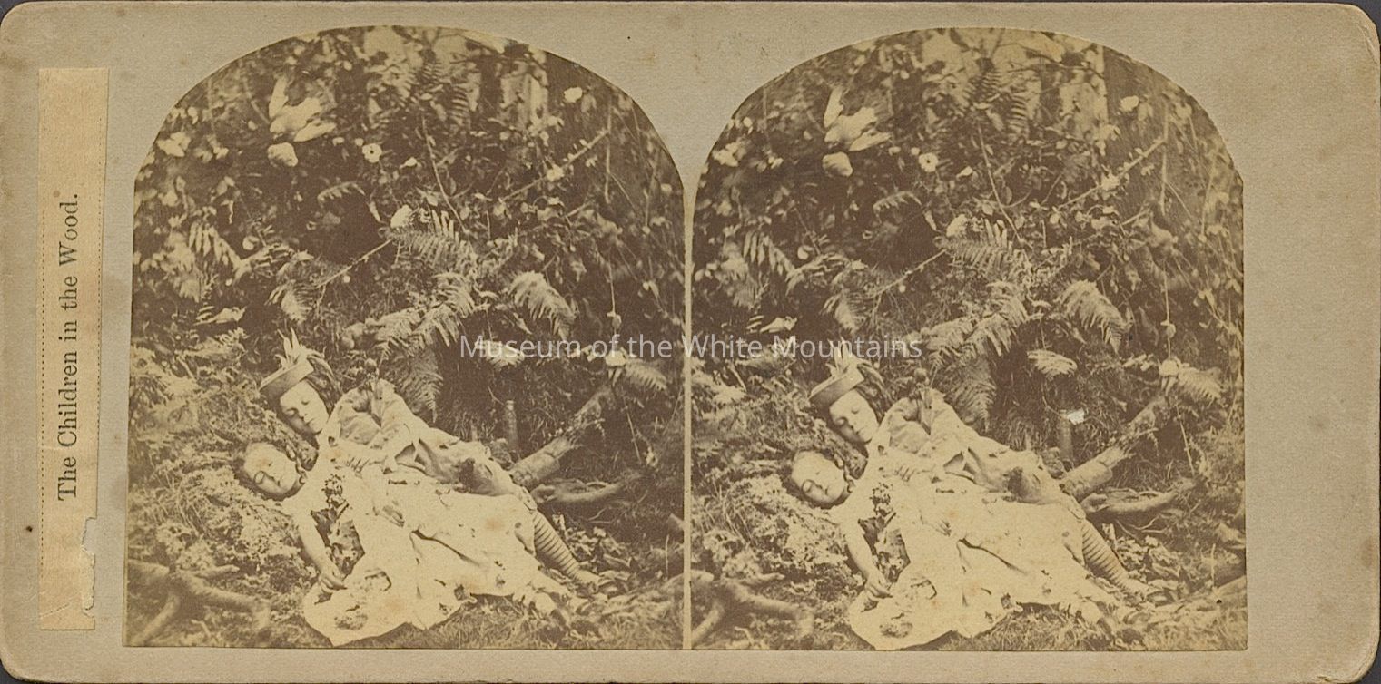Black and white image of children lying sleeping in the woods. Caption reads, "The Children in the Woods." Back Description: Plain