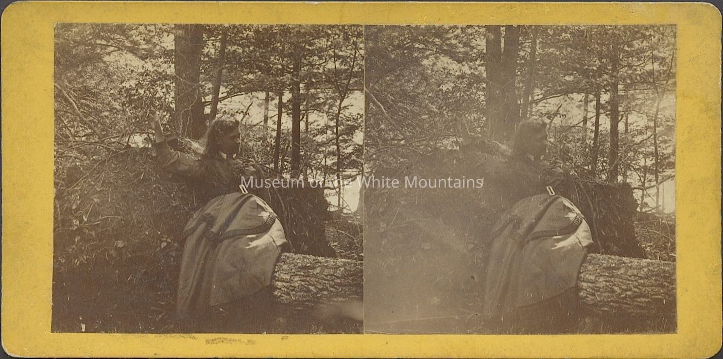 Black and white image of a woman posed on a log in the woods. Back Description: Plain