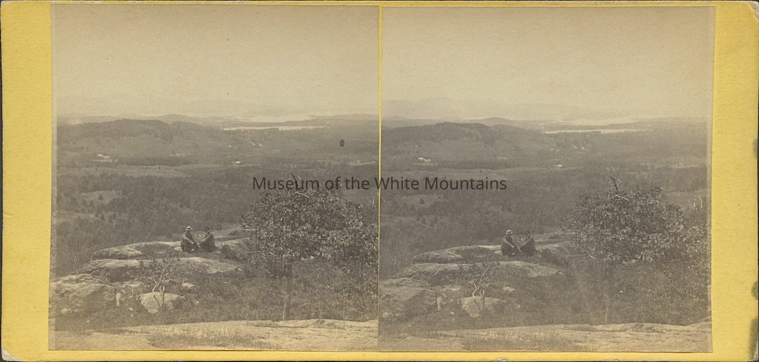 Black and white image of two people sitting on large rocks with mountains in the background. Back Description: Plain