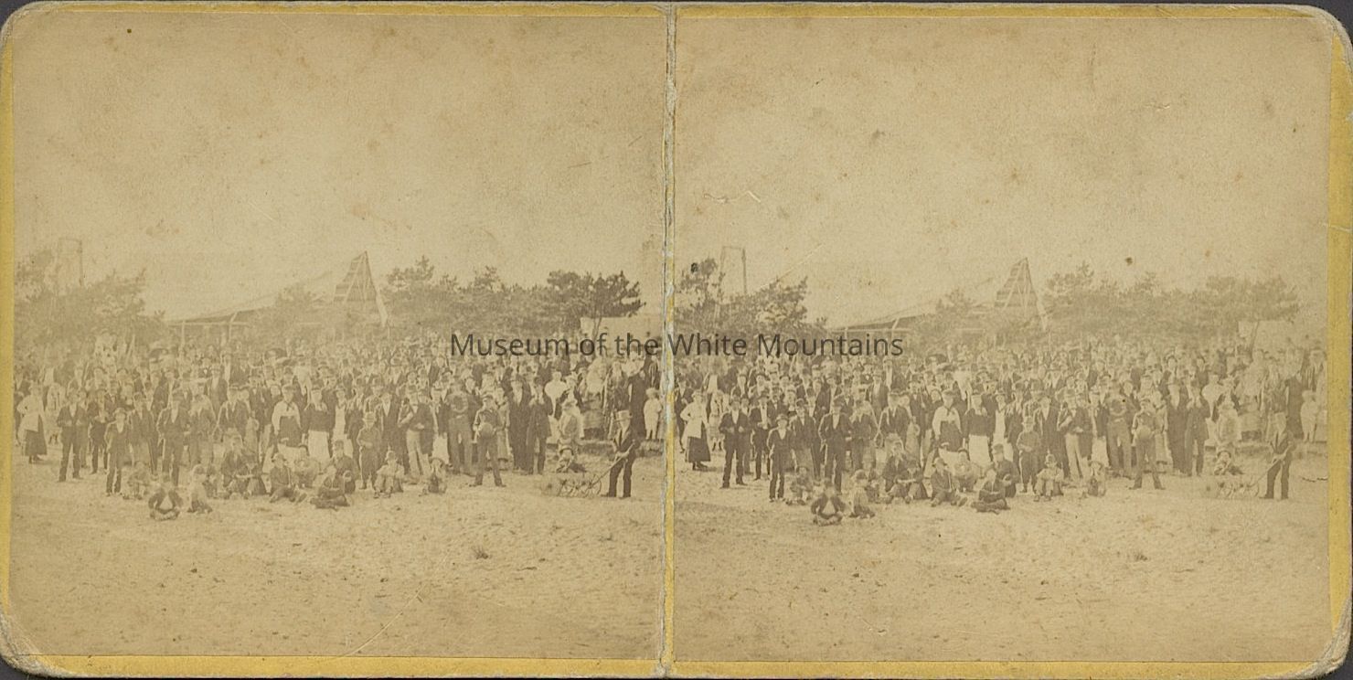 Black and white image of many people gathered posing outside a structure. Back Description: Plain