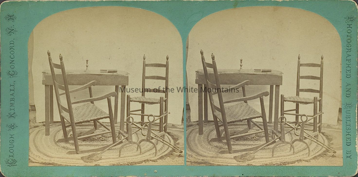 Black and white image of an interior with a table and chairs on a rug and with fireplace tools. Back Description: list of items with "furniture belonging to the Willey Family" highlighted