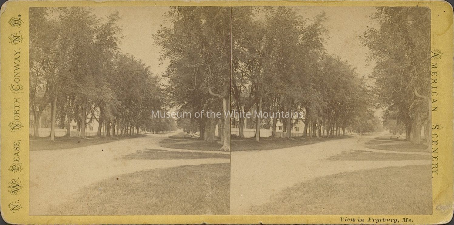 Black and white image of dirt roads lined by trees with buildings behind them. People are in the distance. Caption reads, "View in Fryeburg, ME." Back Description: Plain