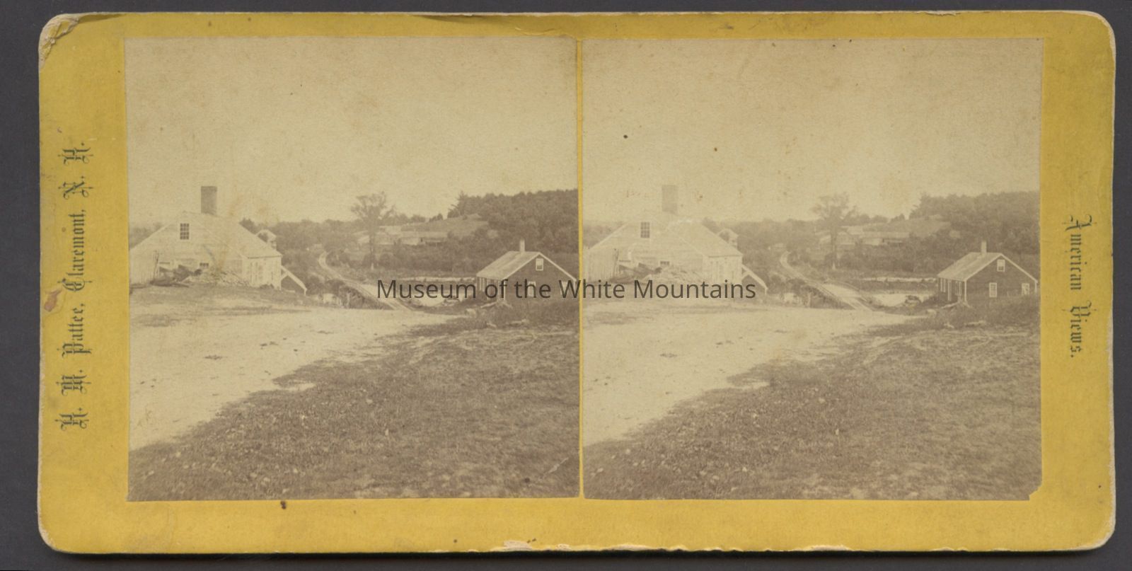 Black and white image of a dirt road leading to farmhouses and a small bridge and more buildings in the distance. Back Description: Plain