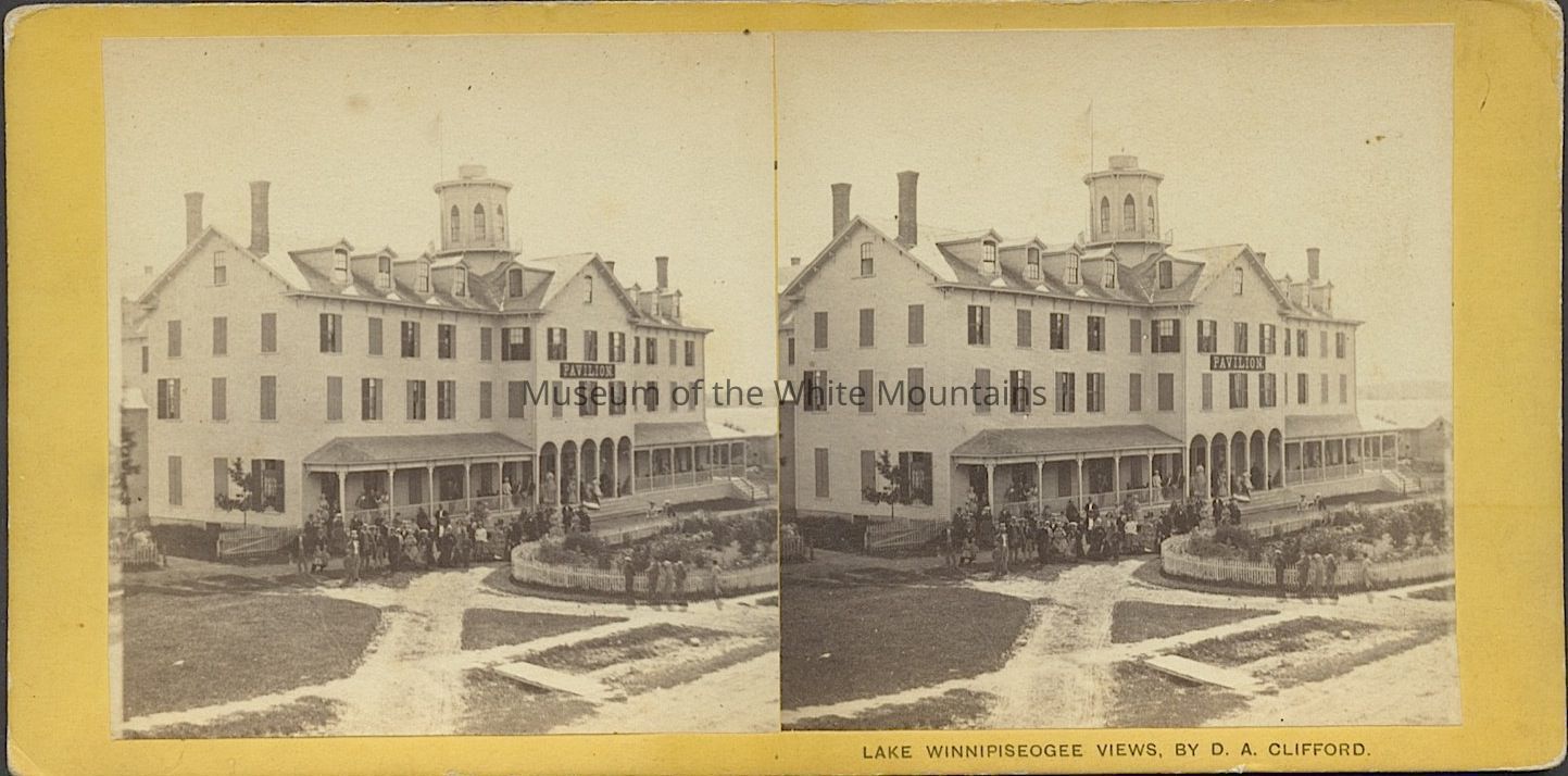 Black and white image of a large hotel or boarding house with a large porch, front portico, many dormers, and a cupola. Many people are out front. Out front is a fenced-in garden. Caption reads, "Lake Winnipiseogee Views by D. A. Clifford."