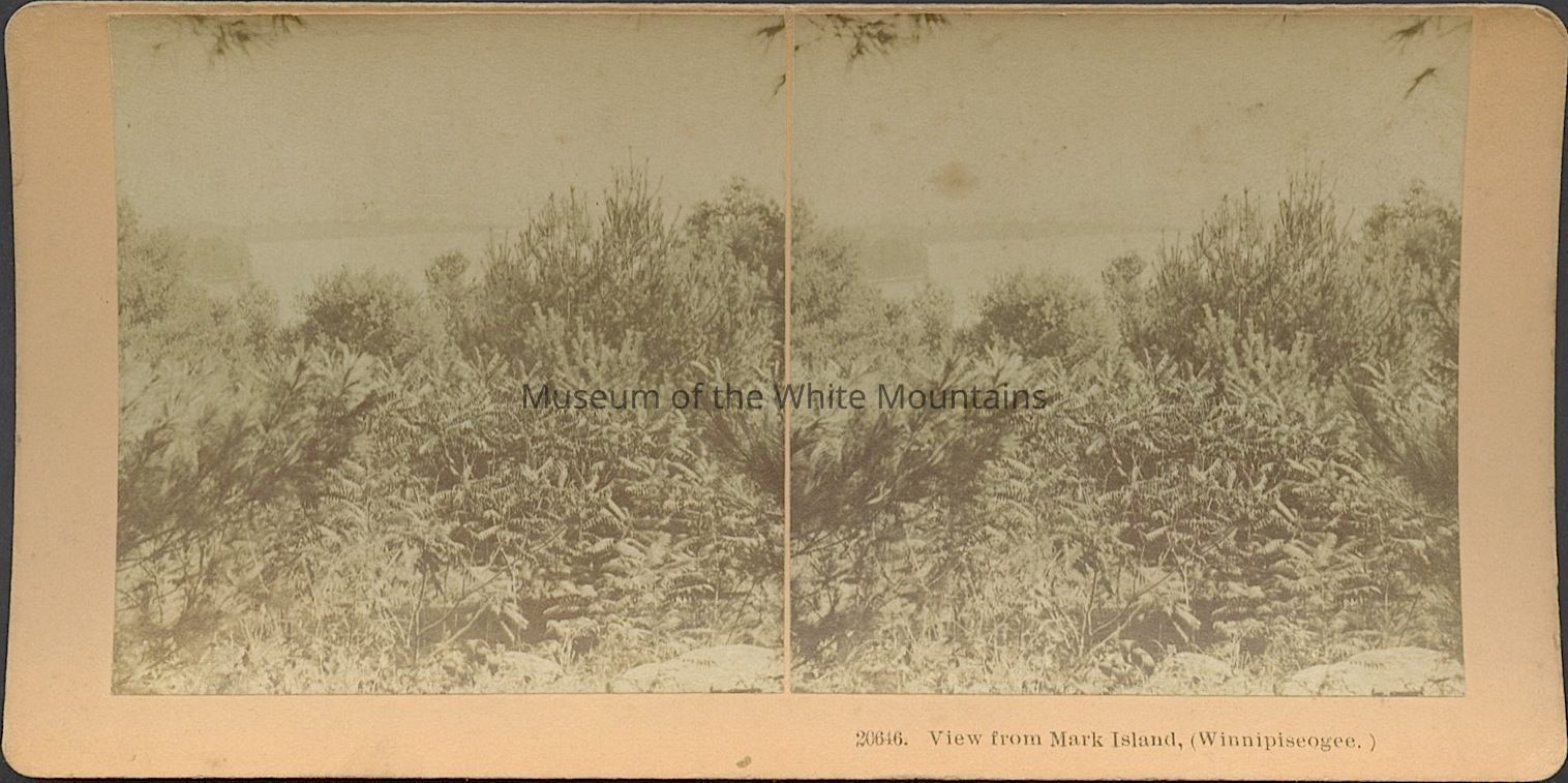 Black and white image of an area with greenery and a lake in the background. Caption reads, "View from Mark Island (Winnipiseogee)." Back Description: Plain